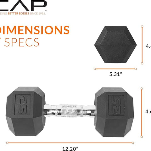 - The CAP 50lb Coated Hex Dumbbells includes a pair of 25 lb coated hex-shaped dumbbells with steel, knurled handle with chrome finish for non-slip grip.