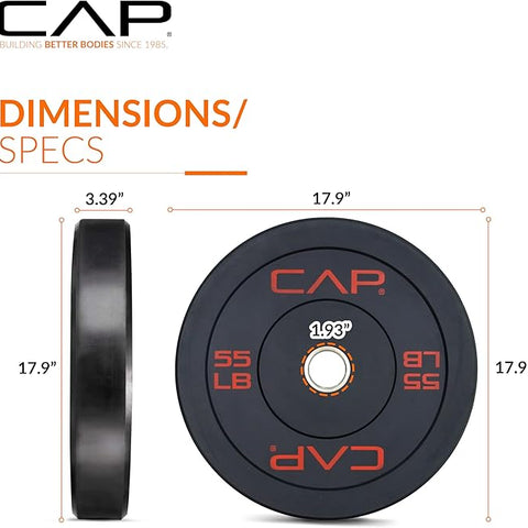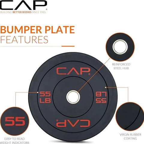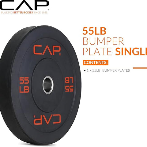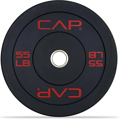 The CAP Barbell Rubber Olympic Bumper Plate is a high-quality weight plate perfect for your home or professional gym. This product, available in various options and colors, is manufactured by CAP Barbell, a trusted brand in the fitness industry. The item type is a weight plate, made of durable rubber material, ensuring long-lasting use and reduced noise during workouts. The number of items included is one. This product is available in the 'WEIGHT PLATE' product type and can be referred to as a 'Weight Plate' or 'weight plate'. Enhance your fitness routine with this reliable and durable weight plate.